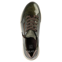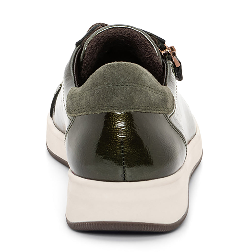 The Rei sneaker features lace up detail, but also a side zip for easy of entry and a heel counter pop of color.